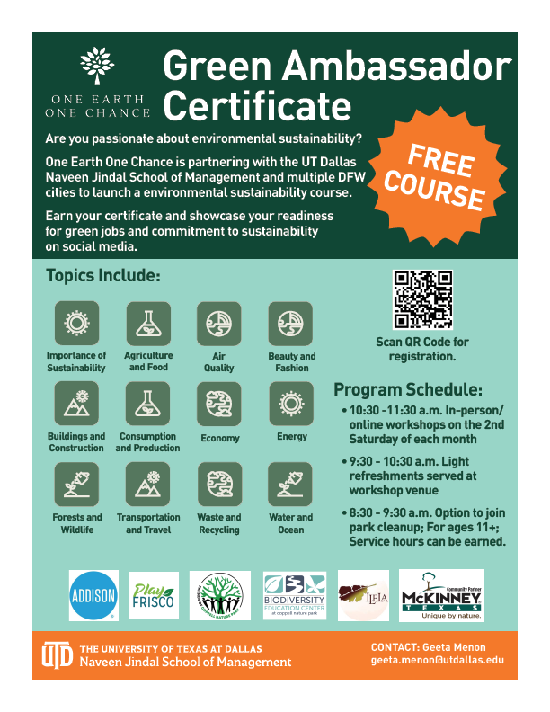 One Earth One Chance, in partnership with UTD and multiple DFW cities, is launching a new education series called the Green Ambassador Certificate to address the need for environmental sustainability education in the community and raise awareness about sustainable choices. These monthly classes will cover various sustainability topics, with each interactive module covering challenges and solutions, regulations, success stories, and actions surveys. Classes are being held every second Saturday of the month from 10:30 to 11:30 AM, with each class offering an in-person and remote option. Each workshop will be proceeded by an optional litter cleanup from 8:30 to 9:30 AM at a nearby park. Upcoming sessions include: